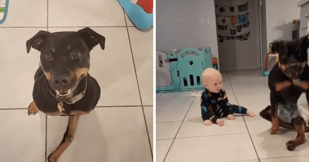 A család örökbefogadott egy béna kutyust – most ő tanítja mászni a babájukat