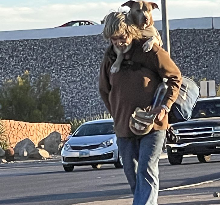 Egy hajléktalan férfi Las Vegasban a hátán viszi a kutyáját mindenhova, amerre csak megy.