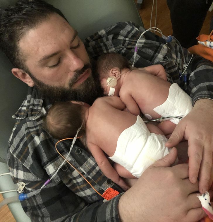A párom először tartja karjaiban az ikerlányainkat.