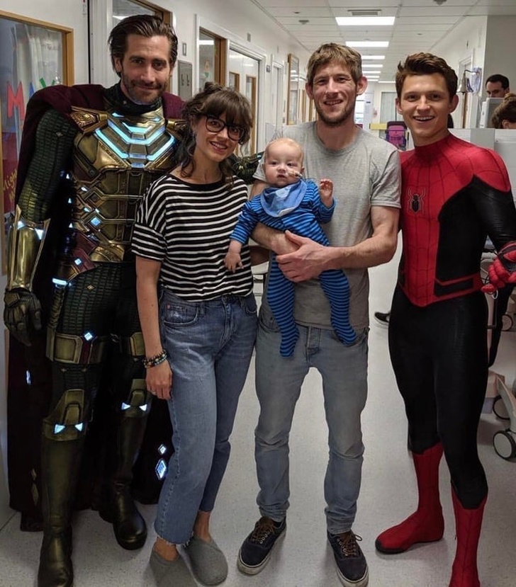 Jake Gyllenhaal és Tom Holland a szuperhősszerkójukban egy londoni gyerekkórházban.