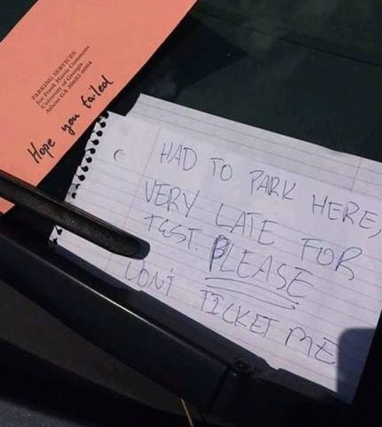 „Ide kellett parkolnom, mert késésben voltam egy vizsgámra. Kérem, ne büntessen meg.”