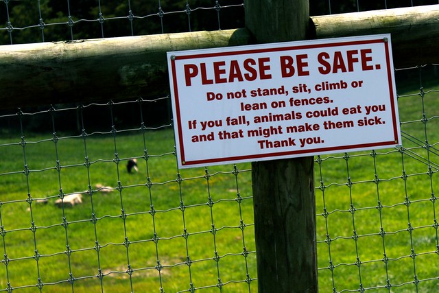 Kérjük légy óvatos. Ne állj, ülj, mássz vagy hajolj át a kerítésen. Ha leesek, az állatok megehetnek és a végén még elkapnak valami betegséget. Köszönjük.