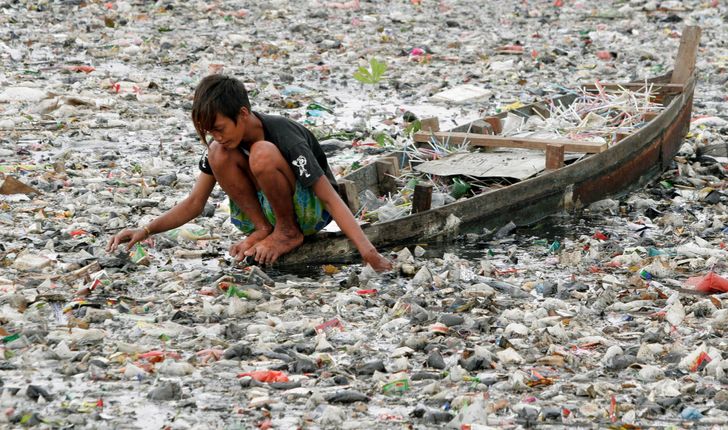 Egyfiú, aki szemetet szelektál egy vihar után a parton