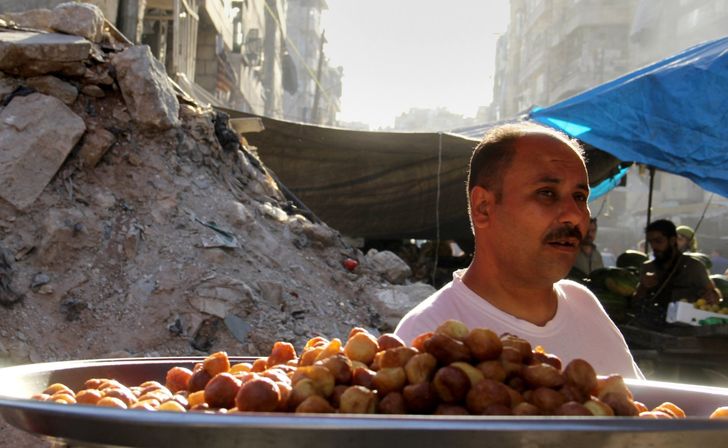 Egy ember, aki édességeket árul egy háború által elpusztított városban