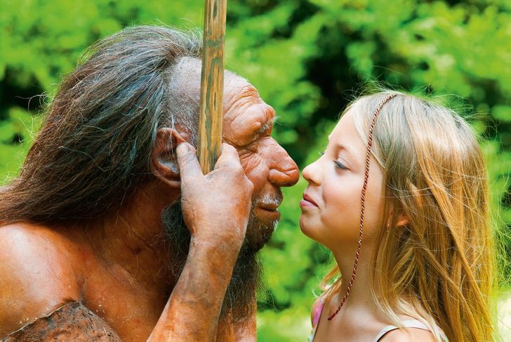 Egy lány és egy neandervölgyi alak egy múzeumban
