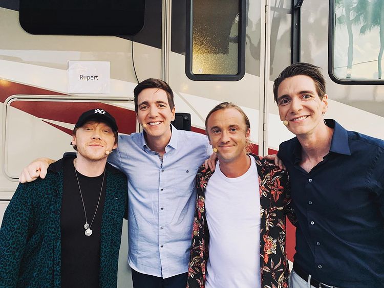 Fred, George és Ron Weasley (James és Oliver Phelps és Rupert Grint) Tom Feltonnal.