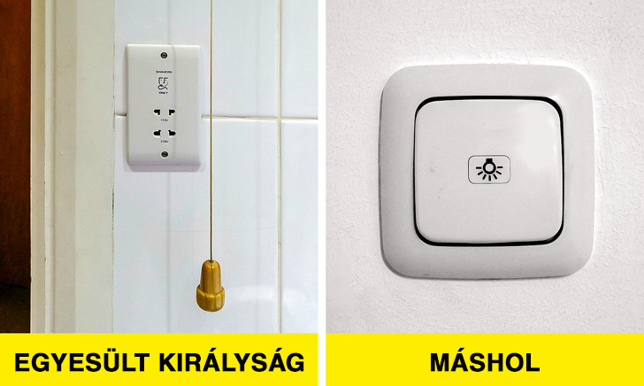 A régi angol házak fürdőszobáiban még ma is találkozhatunk mennyezetről lógó villanykapcsolóval, ennek pedig nagyon egyszerű a magyarázata. Az angolok ugyanis úgy tartották, hogy a szabványos villanykapcsolók nem elég biztonságosak a ház fürdőszobájában (a pára miatt), és mivel féltek az áramütéstől, ezért ilyen, mennyezetről lógó villanykapcsolókat alakítottak ki.