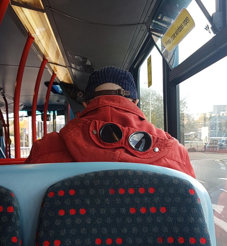 Ennek a fickónak a kabátjának a kapucniján egy beépített napszemüveg van.