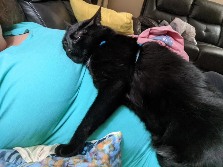 A férjem ezt alvás közben vette le. A macskánk, Zell, 10-szer szeretetteljesebb, mióta terhes vagyok. A harmadik trimeszteremben vagyok az első babánkkal.