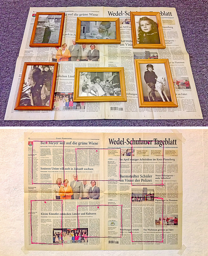 Annak érdekében, hogy egy fotó- vagy festmény kollázst a lehető legkisebb lyukakkal a falon akasszunk fel, helyezd a kereteket egy újságlapra. Rajzold körbe a kereteket egy jelölővel, és jelöld meg a csavarok helyét. Ezután erősítsd a papírsablont a falhoz és fúrd be a rögzítő furatokat.