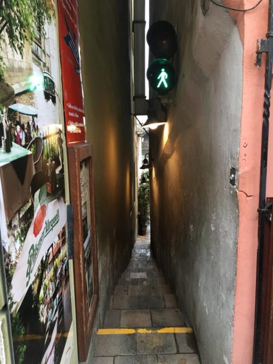 Ez a prágai utca olyan szűk, hogy jelzőlámpa engedi a gyalogosokat, máskülönben nem férnének el egymás mellett
