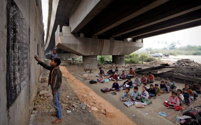 Iskola a híd alatt, Új-Delhi. Rajesh Kumar Sharma „nyitotta” meg ezt az ingyenes iskolát a város szegény gyerekei számára.