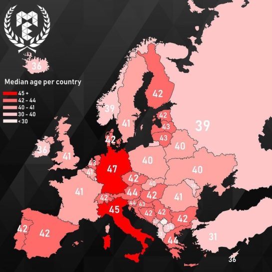Európa lakosságának átlag medián életkora
