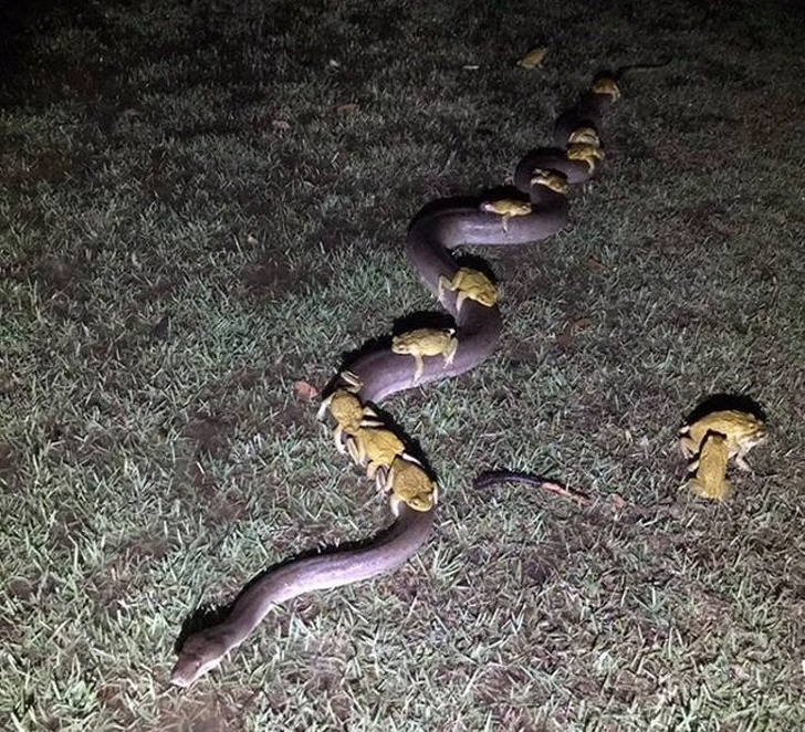 Csak néhány szellemes béka, amelyek egy piton hátán lovagolnak