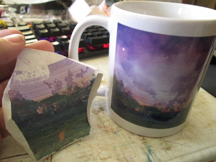 11 nappal ezelőtt egy képet posztoltam a törött festett bögrém belsejéről, majd egy másik Reddit felhasználó befejezte a jelenet megfestését. Ma érkezett egy csomag, amely teljessé tette az egészet