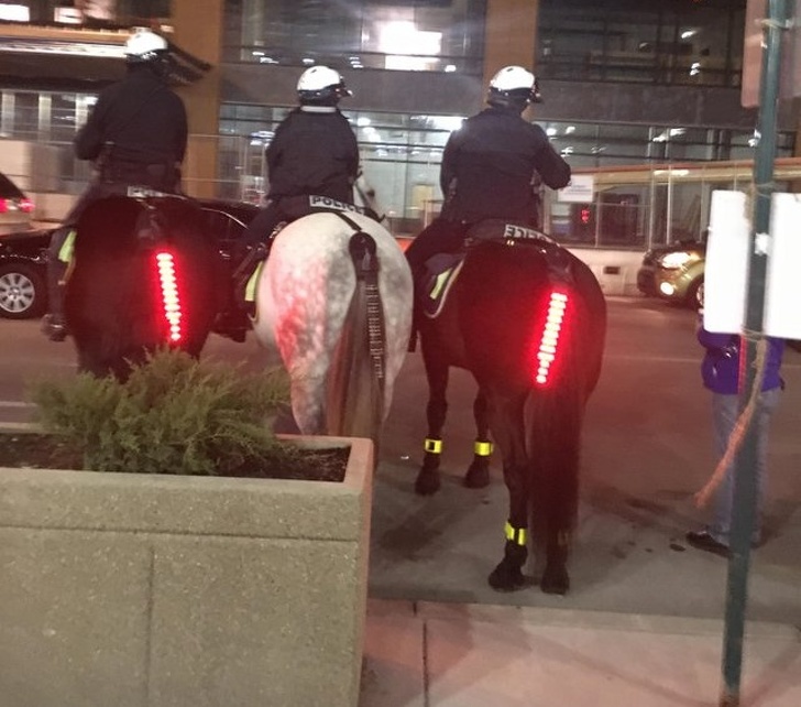 Rendőrségi lovak jelzőlámpákkal a farkukon