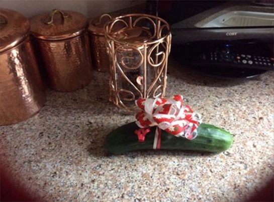 A nagypapám későn tudta meg, hogy ma van a születésnapom, ezért kisunnyogott a konyhába, kötött egy masnit az uborkára és azt adta nekem meglepetésként