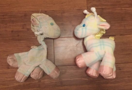 Balra egy játék zsiráf, amit én kaptam édesanyámtól 29 évvel ezelőtt, jobbra pedig ugyanaz a zsiráf, csak ezt épp most készül odaadni az én fiamnak