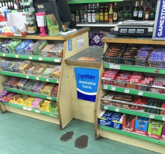 Egy kisbolt, amelynek a vásárlói mindig ugyanott fizetnek és ez a padlón is jól látható