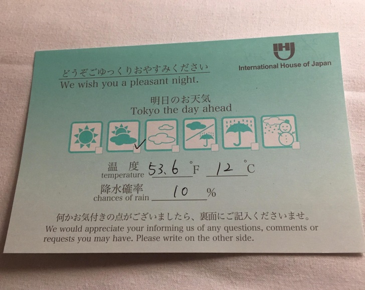 Egy Tokiói hotel kis értesítőt ad át a következő napra várható időjárásról