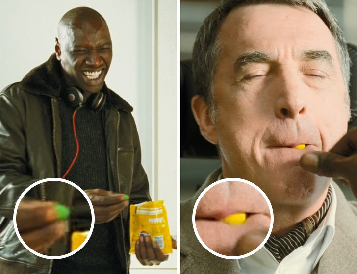 Életrevalók: Driss szemmel láthatóan zöld cukrokát vesz ki a csomagból, de a következő jelenetben már sárga színűt tesz Philippe szájába