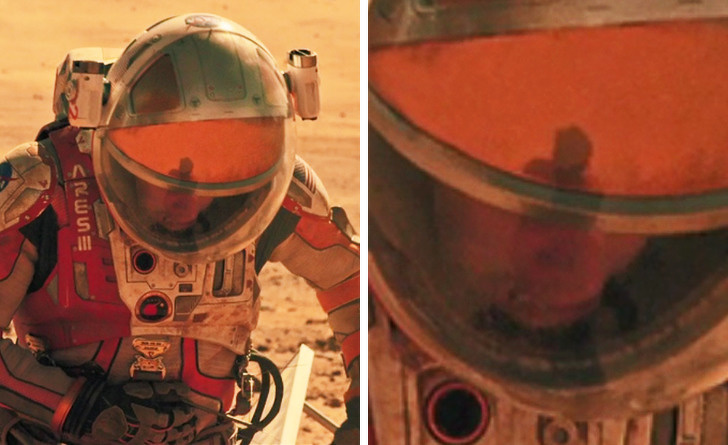 Mentőexpedíció: amikor Mark felébred a vihar után, látható a sisakja tükröződésén a kamerát kezelő operatőr