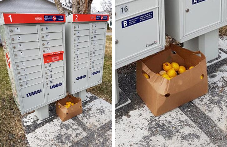 Valaki otthagyott egy láda friss gyümölcsöt a közös postaládánál.