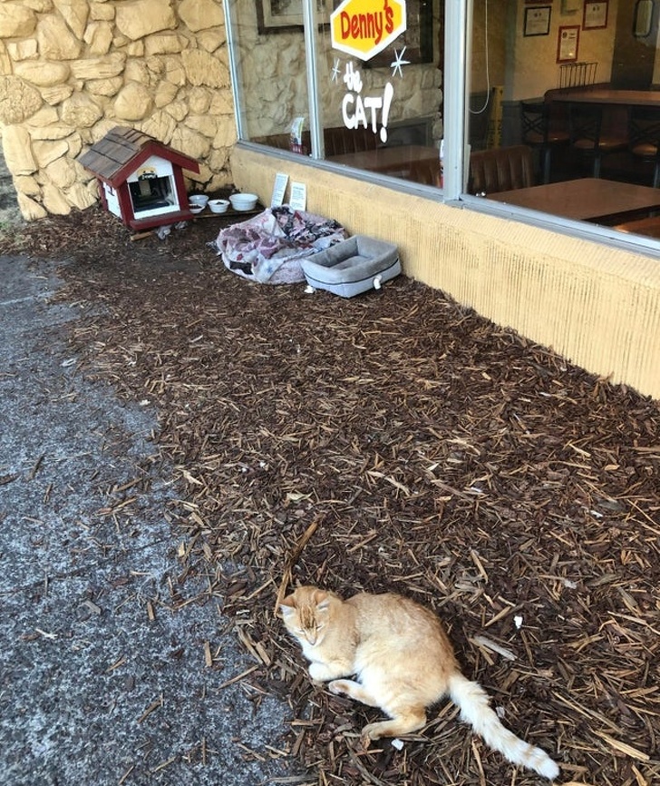 Egy kóbor macskának kiépített kis ház, ágy és etető/itató.