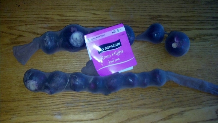Régi harisnyában tárolt hagymák