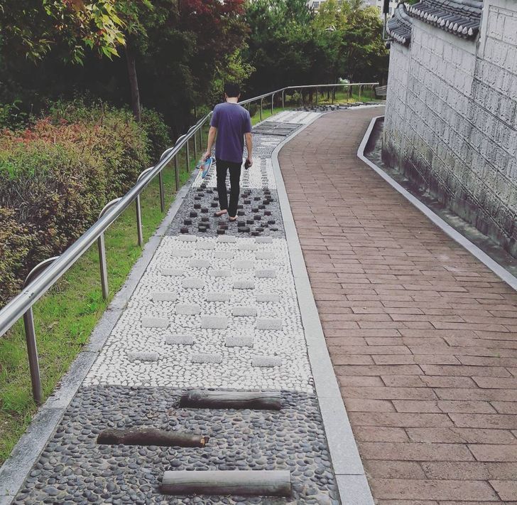 Sok parkban különleges kőutak találhatók, ezeken a koreaiak mezítláb sétálnak, hogy megmasszírozzák a talpukat, és felfrissüljenek.