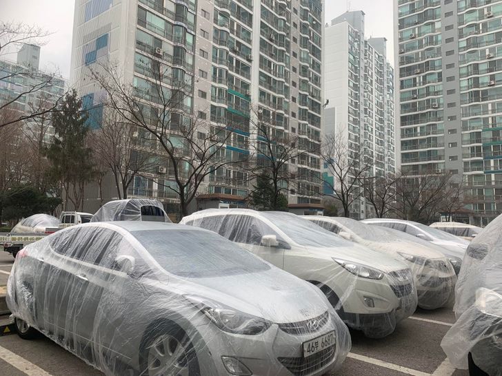 Amikor a panelházakat újrafestik, az összes környéken parkoló autót fóliával borítják be, hogy megvédjék őket a festékcseppektől.