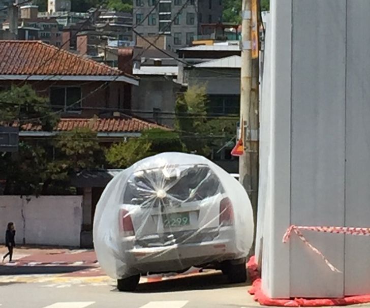 Ez minden más helyen is így működik: ha a közelben parkoló autók mellett poros vagy éppen festékes munkát végeznek, akkor a munka megkezdése előtt a munkások gondosan „becsomagolják” a gépjárműveket.