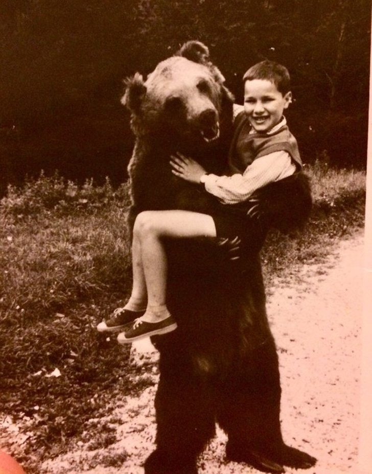 „Ijesztően valósághű medvejelmez karjaiban, korai ’70-es évek.”