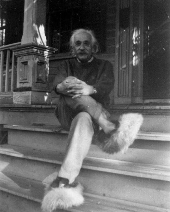 Albert Einstein bolyhos szőrmepapucsban, 1950 körül