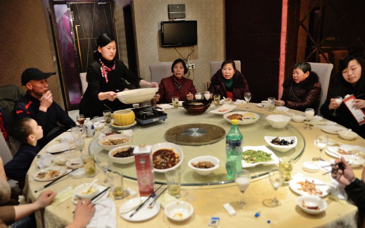 Az éttermekben az ételeket mindig egy asztal közepén található forgó tálcára helyezik, ahonnan mindenki kedvére szedhet a neki tetsző ételből.