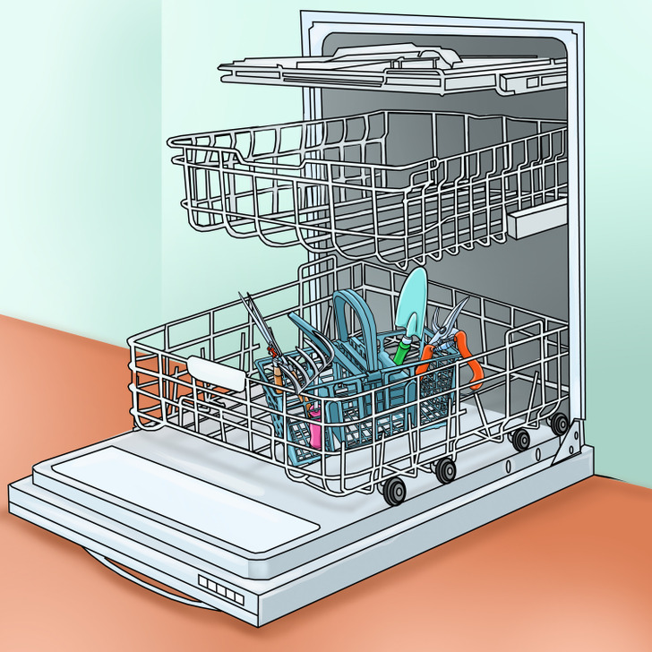 A kerti szerszámok és minden más, a ház körül használt eszköz betehető a mosogatógépbe. Csak egy fontos szabály van: műanyagnak és fémnek kell lenniük. A fa nyelű és acélból készült szerszámokat távol kell tartani a mosogatógéptől, mivel a gép többet árt, mint használ. Ügyelj arra, hogy egyedül, edények és evőeszközök nélkül mosd el őket.