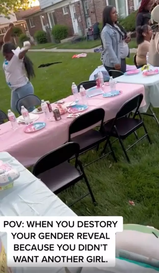 Ahogy kiderült a baba neme, az anyuka letépte a parti lobogót és elhagyja a bulit, miközben a vendégek sokkos állapotban állnak.