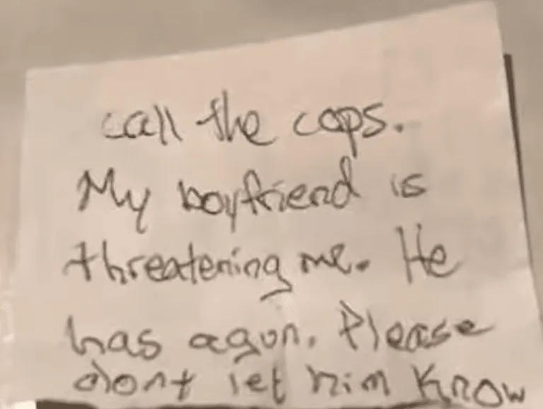 „Hívd a rendőrséget! A barátom fenyeget engem. Fegyver van nála. Kérem, ne hagyják, hogy megtudja.”