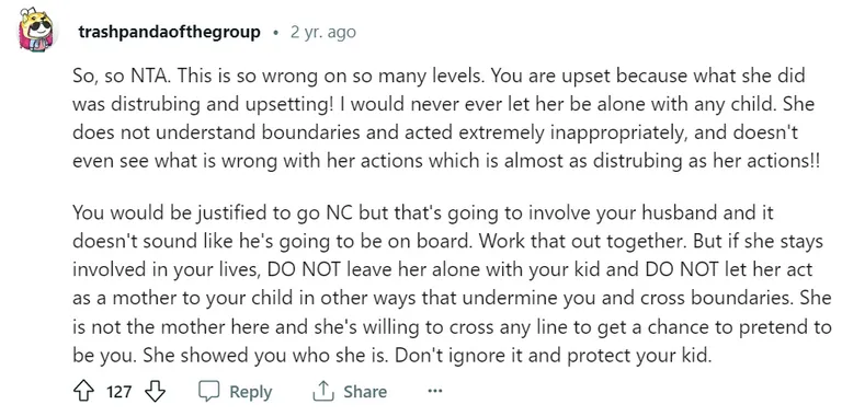 Bár a férje megértette az álláspontját, kifejezte, hogy szeretne egy második esélyt adni az édesanyjának, hogy vigyázzon a fiukra, különösen, hogy a nő úgy döntött, ingyen vigyáz rá. Felesége azonban továbbra is biztos volt abban, hogy anyósa hibázott, és nem volt hajlandó újra látni őt, vagy egyáltalán a gyermeke közelébe engedni.