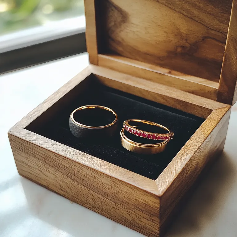Belül egy évfordulós kártyát találtam. Volt benne leeresztett lufi és két gyűrű is. Az egyik egy egyszerű, férfias szalag volt, a másik pedig egy finom, nőies mintájú.