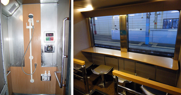 A zuhanyzás némileg bonyolultabb, ezt ugyanis speciális kártya segítségével veheti igénybe az utasok; vagy ingyenesen vagy pedig díj ellenében – attól függően, hogy ki-milyen jegyet vásárolt. A zuhanyzásra összesen 6 perc áll rendelkezésre, melyet egy kis visszaszámláló kijelzőn keresztül lehet nyomon követni, így érdemes odafigyelni, hogy még az idő lejárta előtt alaposan lemossuk magunkról a tusfürdőt és a sampont, máskülönben kellemetlen helyzetbe kerülhetünk.