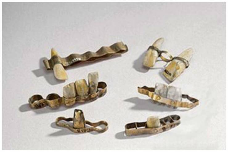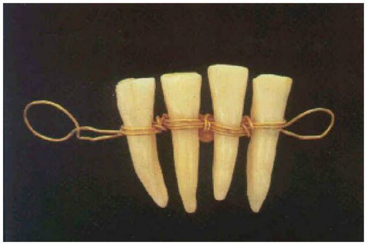 Nem csak emberi, de állati fogakból is készítettek műfogsort. Ez a képen látható darab az i. e. 4. századból származik és arany dróttal rögzített állati eredetű fogakat tartalmaz