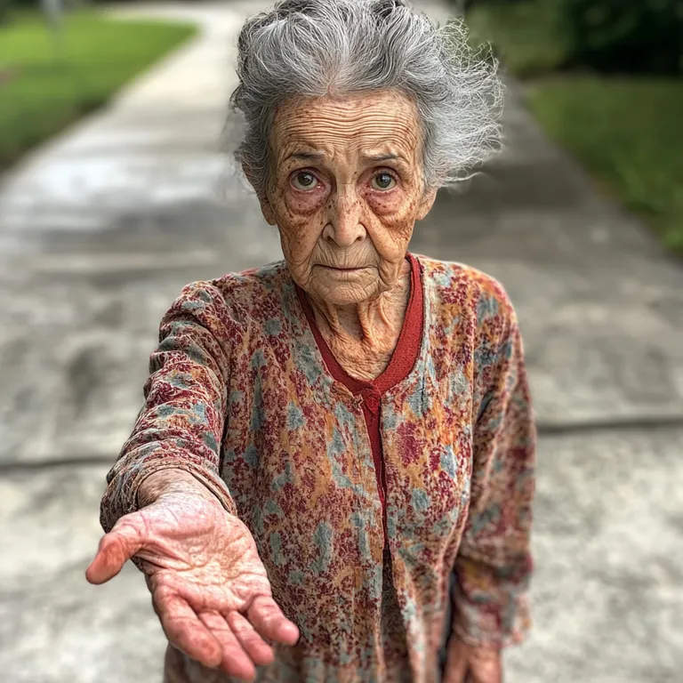 A kertemet átszelő ösvény mellett állt. Egy idősebb nő, időjárásfüggő bőrrel, vad ősz hajjal, és olyan ruhákkal, mintha hetek óta nem mosták volna ki.