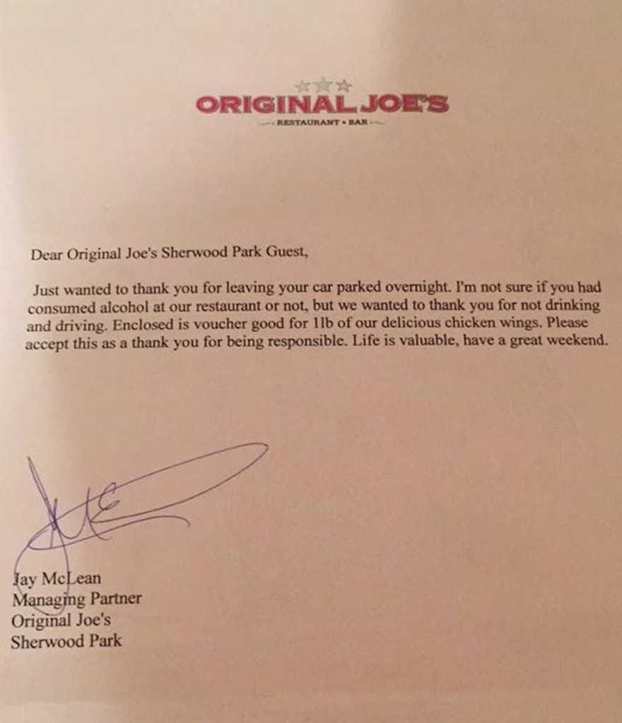„Csak meg akartam köszönni, hogy éjszakára itt hagyta az autóját. Nem vagyok benne biztos, hogy fogyasztott-e alkoholt az éttermünkben vagy sem, de azért szerettem volna megköszönni, hogy nem vezetett alkoholfogyasztás után. Ez a jegy 1 kg csirkeszárnyat ér, ha vissza akar jönni, kérem, fogadja el köszönetképpen, hogy felelősségteljes volt. Az élet túl értékes, legyen szép hétvégéje.”