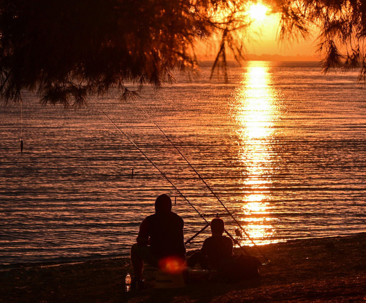 Apa & fia horgászat a naplementében.