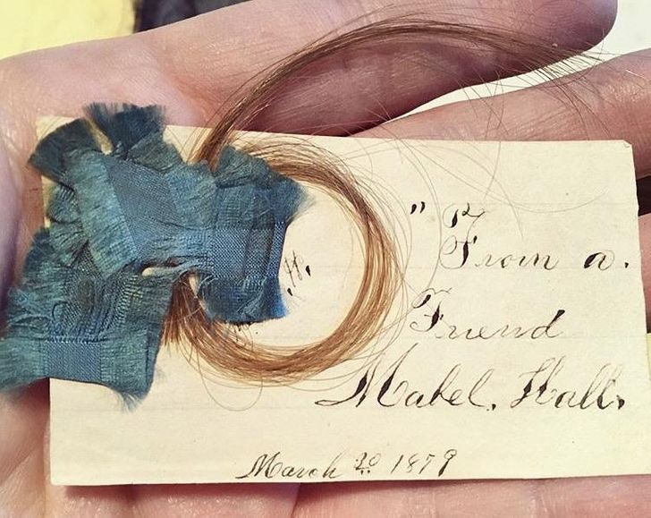 Hajfürt 1879-ből, amit egy, a virágok jelentéséről szóló könyvben találtam. A feljegyzés így szól: “Mabel Halltól, 1879. március 20.”