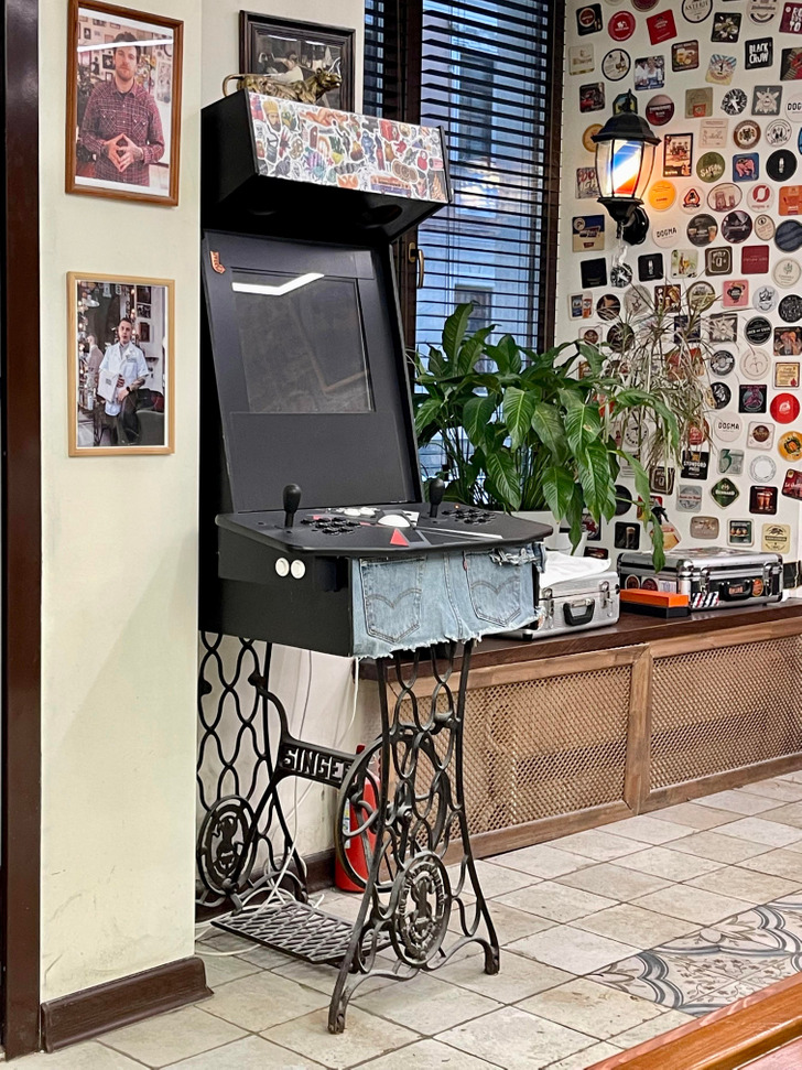 DIY játékgép, amit egy varrógép asztalára szereltek.