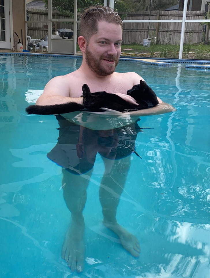 Úgy gondolta, hogy vicces lesz a medencébe vinni a macskát.