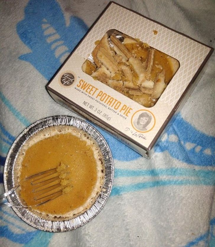 Megette a pitéjét, de úgy, hogy ki sem vette a dobozból.