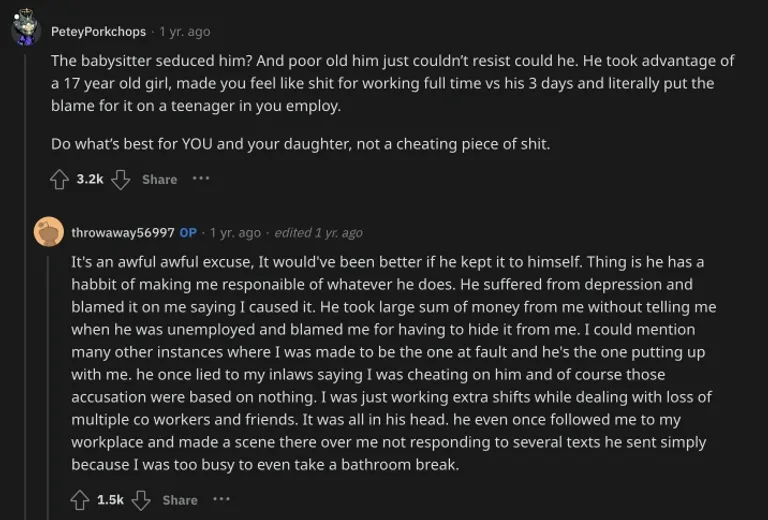 Volt egy másik, aki megjegyezte, hogy a férj két kifogást talált ki, az egyik, hogy a nő túlságosan a munkájára koncentrált, a másik pedig, hogy a bébiszitter elcsábította őt. Az illető azt mondta, hogy ők is végeztek volna a férjjel, ha ugyanebben a helyzetben lettek volna.